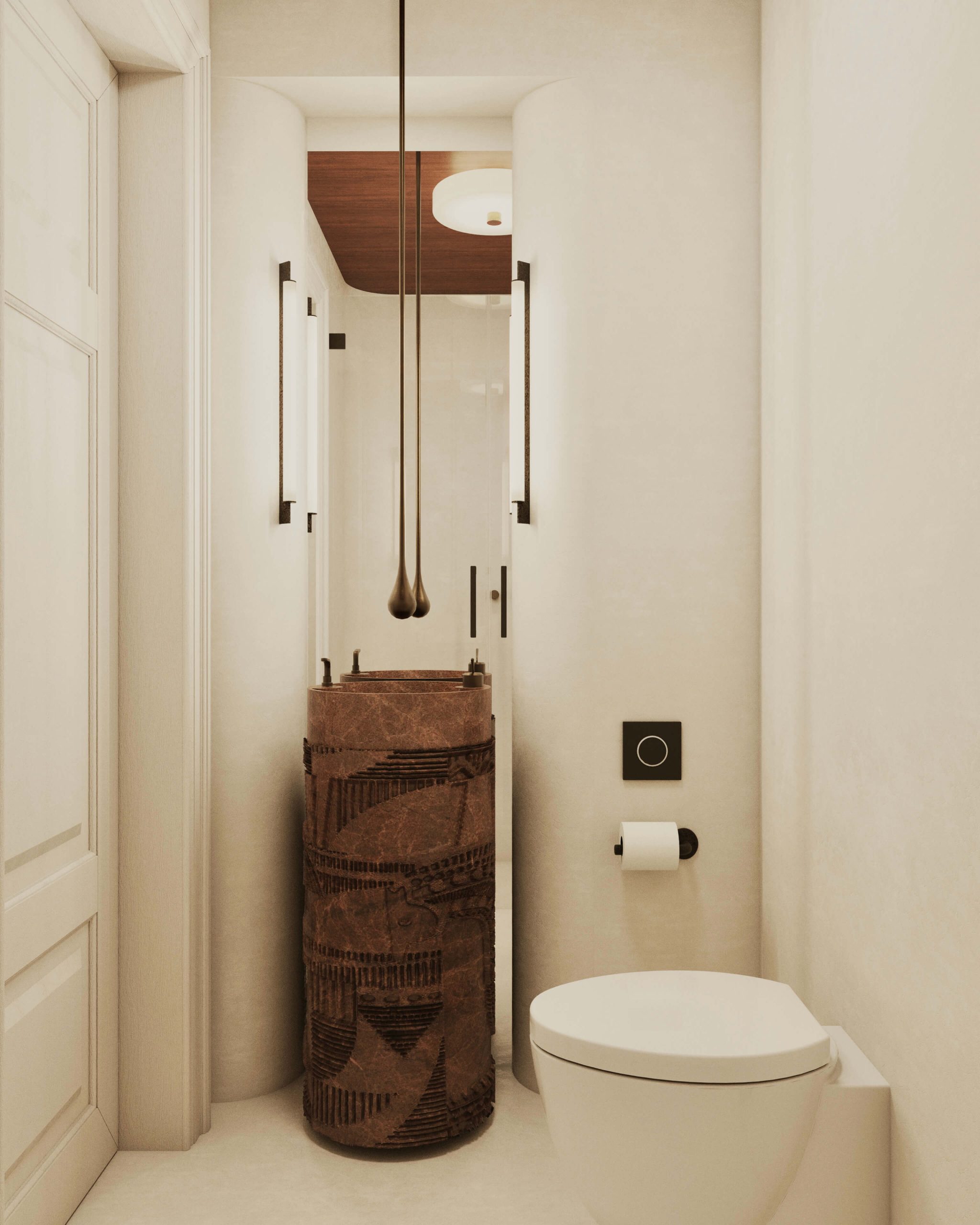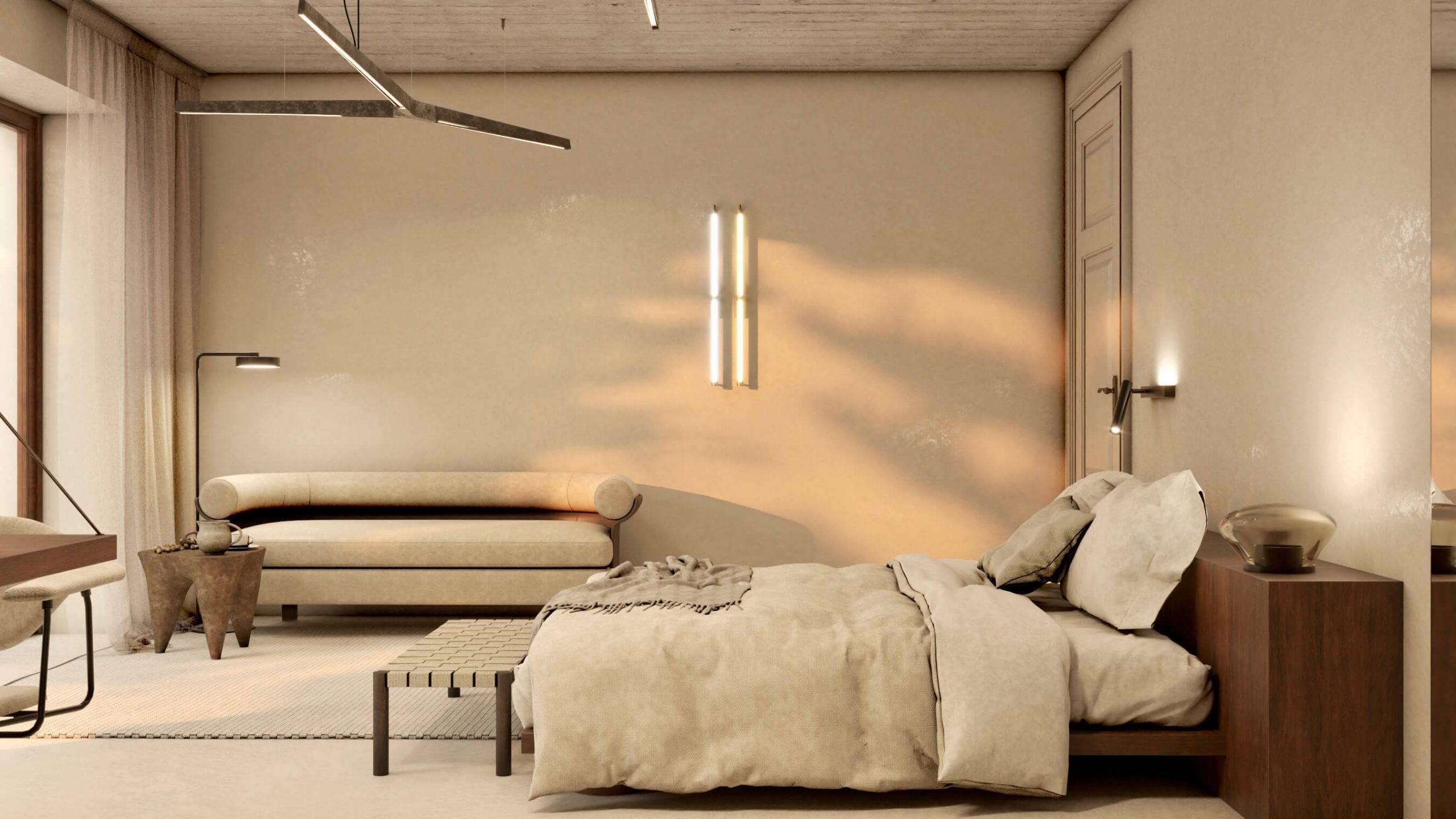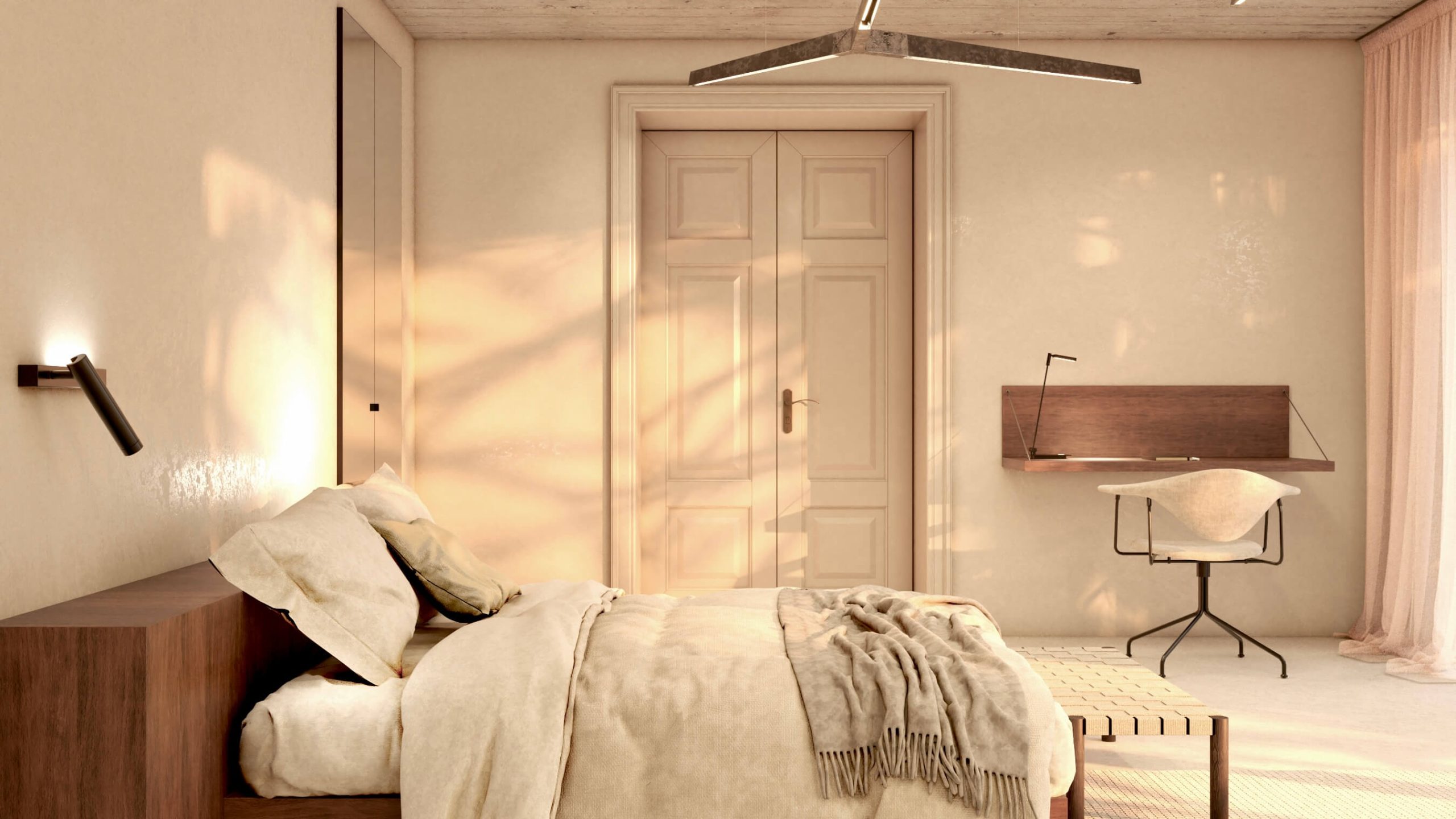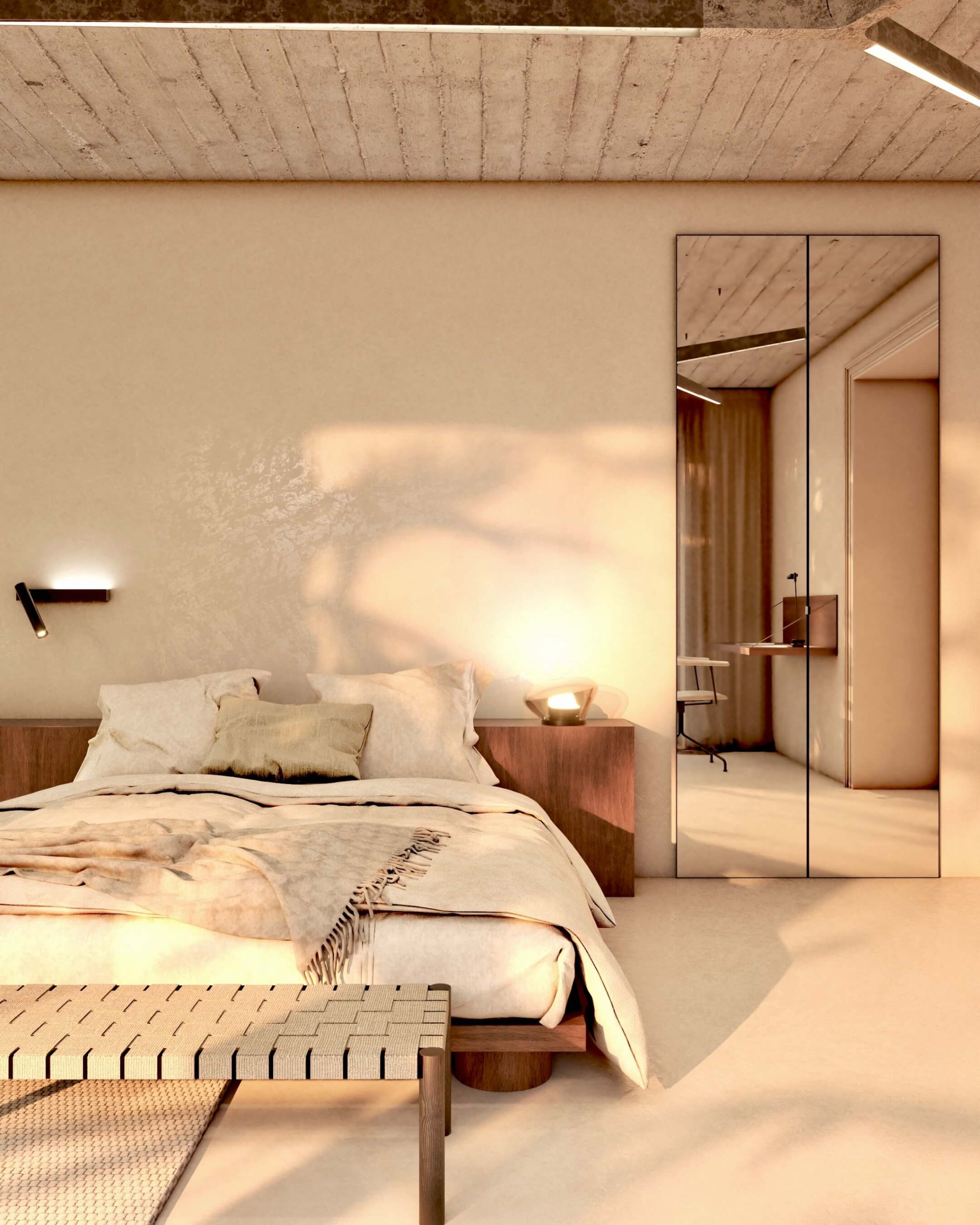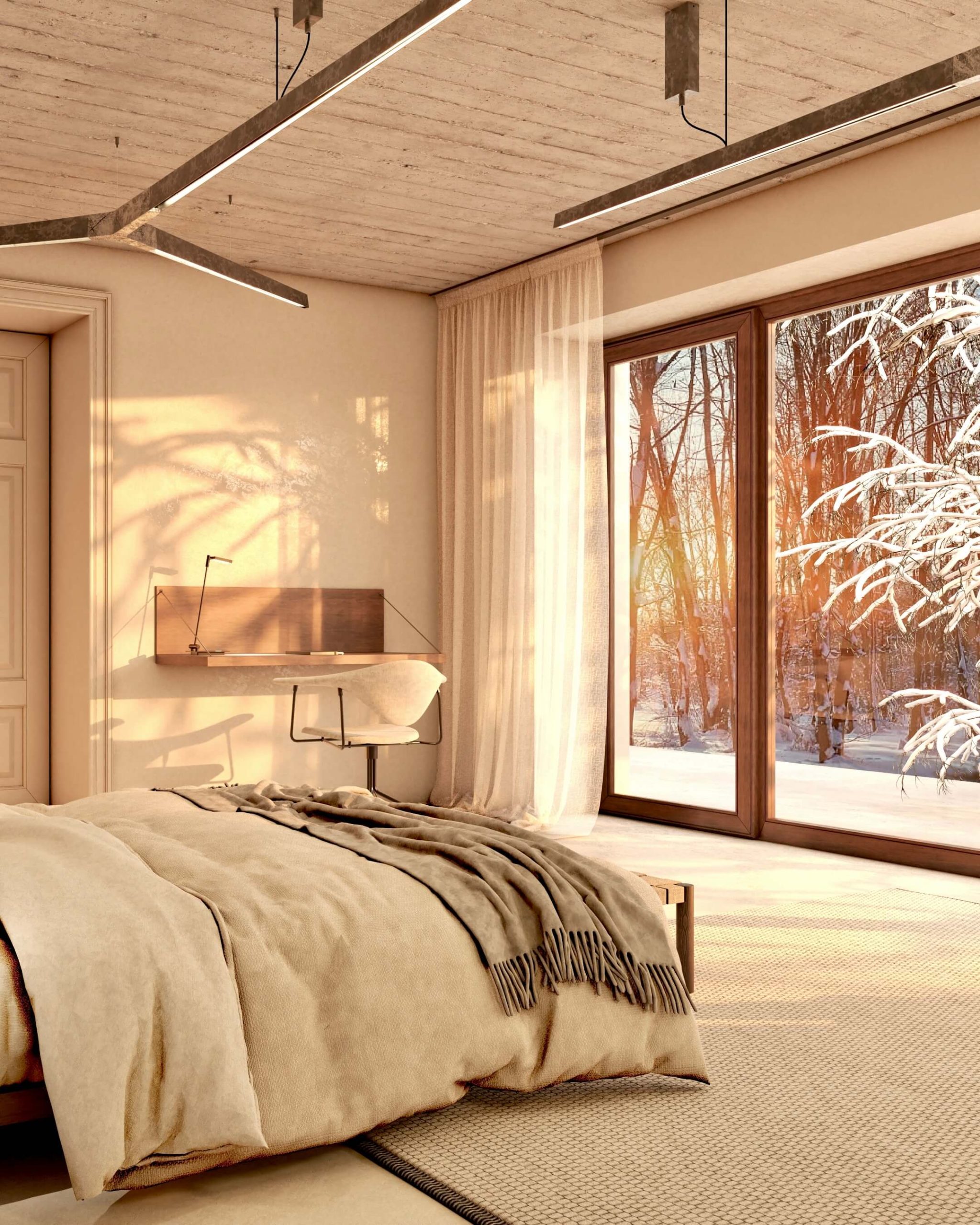 Jeden z czterech pokoi w pensjonacie, utrzymany w prostym, minimalnym stylu. Założeniem naszym było podporządkowanie wnętrza zewnętrzu, skierowanie głównej uwagi na życie za oknem.
